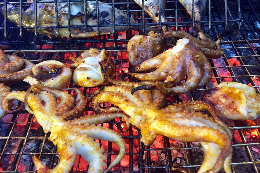 Bạch tuộc nướng sa tế cay cay giòn giòn cùng mùi thơm hấp dẫn khó chối từ, nhâm nhi thêm một vài cốc bia là say "quên lối về" luôn đó nha.