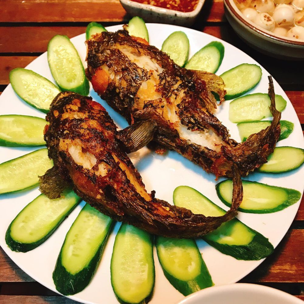 Cá mao ếch nướng muối ớt: Cá được ướp đậm đà với muối ớt rồi nướng trên than hồng. Lớp da bên ngoài giòn nhẹ, thịt bên trong dai ngọt, thơm nức mũi.