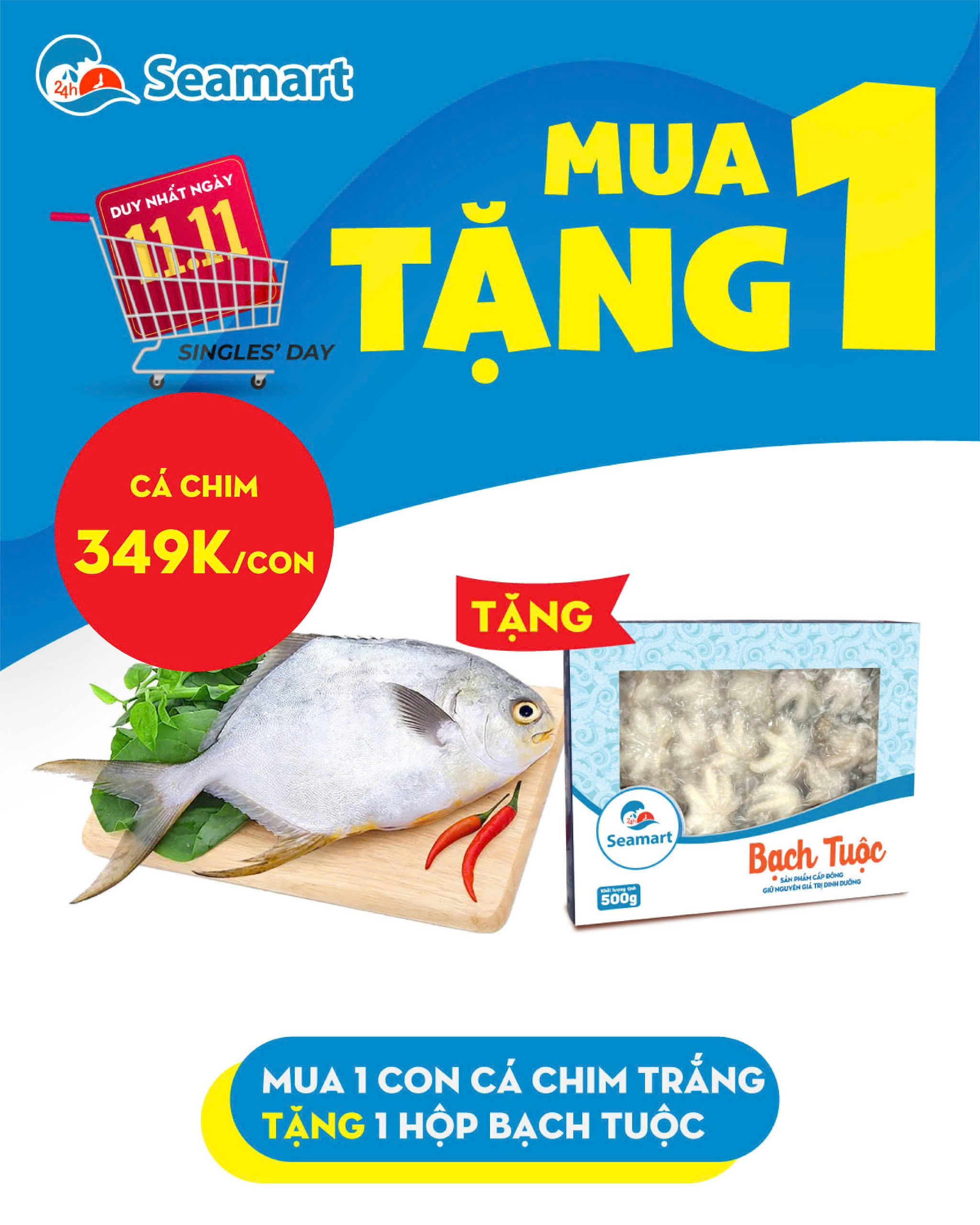- Mua 1 con cá chim trắng (0,8 - 1kg/con): Tặng ngay hộp bạch tuộc 500g trị giá 110k. Combo cá chim trắng và bạch tuộc chỉ từ 349k (giá gốc 500k)